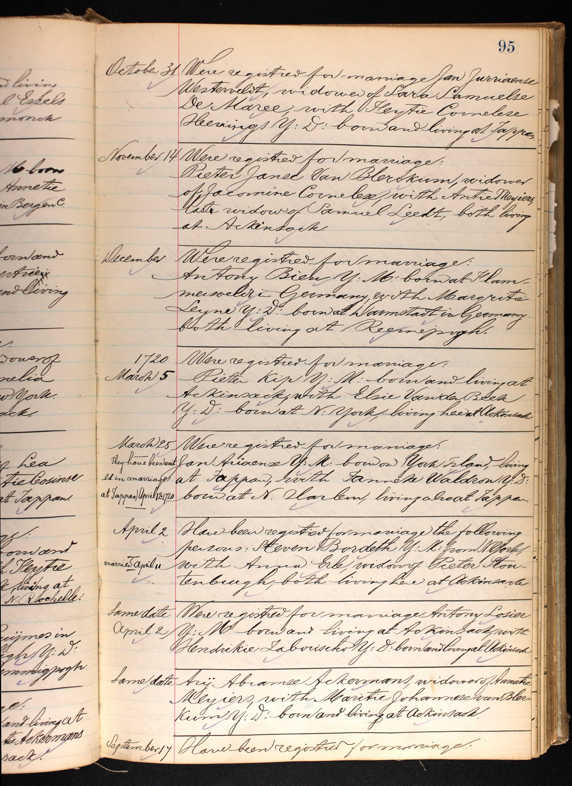 Antje Meyers Van Blarcom Antje Meyers was widow of Samuel Leeds and was the third wife of Pieter Janse Van Blarcom. Antje and Pieter married in Hackensack, November 14, 1719. they had one son, Harmen, in 1720.