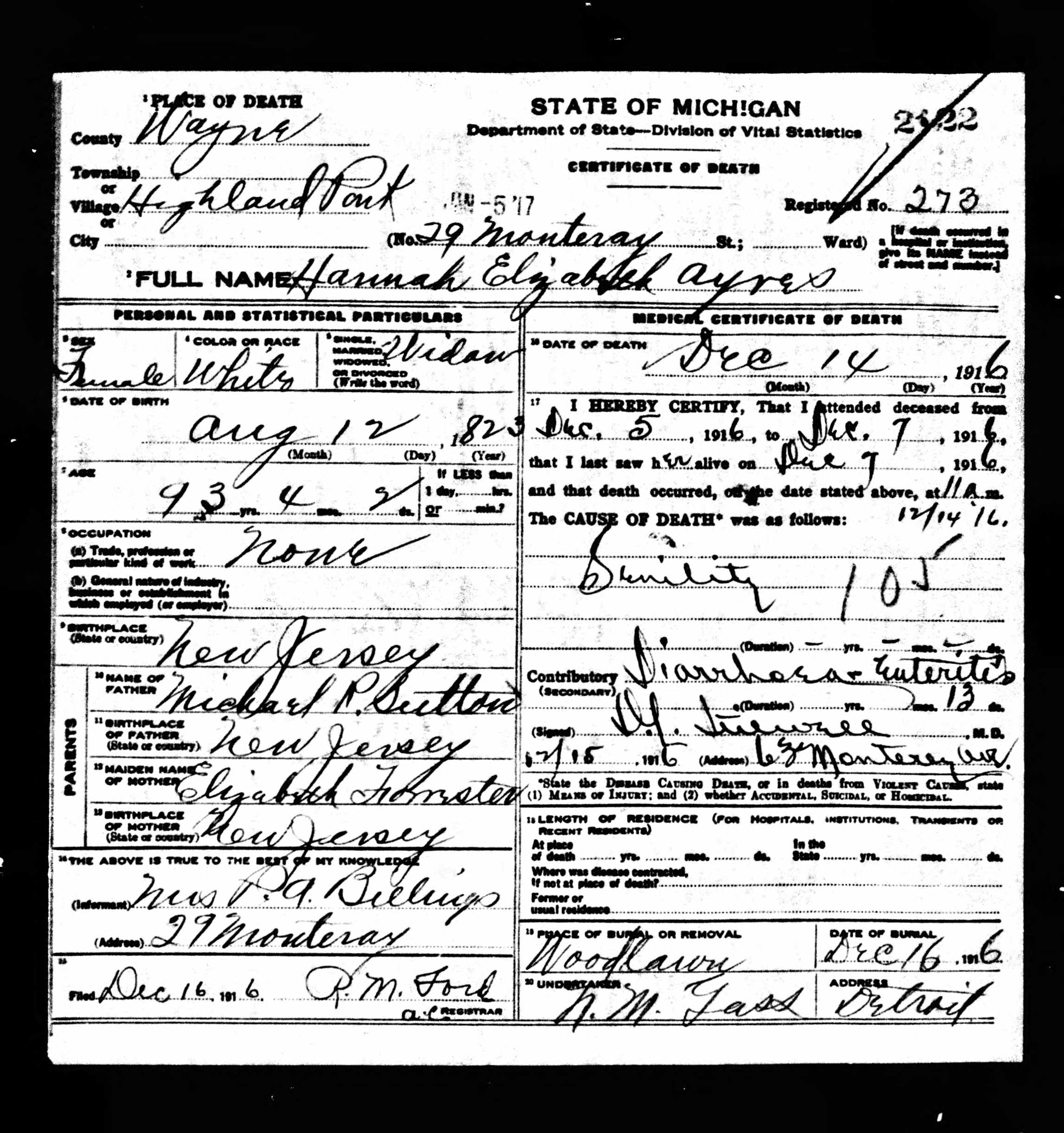 Hannah Elizabeth Sutton Ayres died in 1916 at the age of 93. Her death certificate lists senility as the major cause. She is buried on a large Sutton/Ayres plot with her mother, husband, and some of her children at Romeo Cemetery in Romeo, Macomb County, Michigan.
