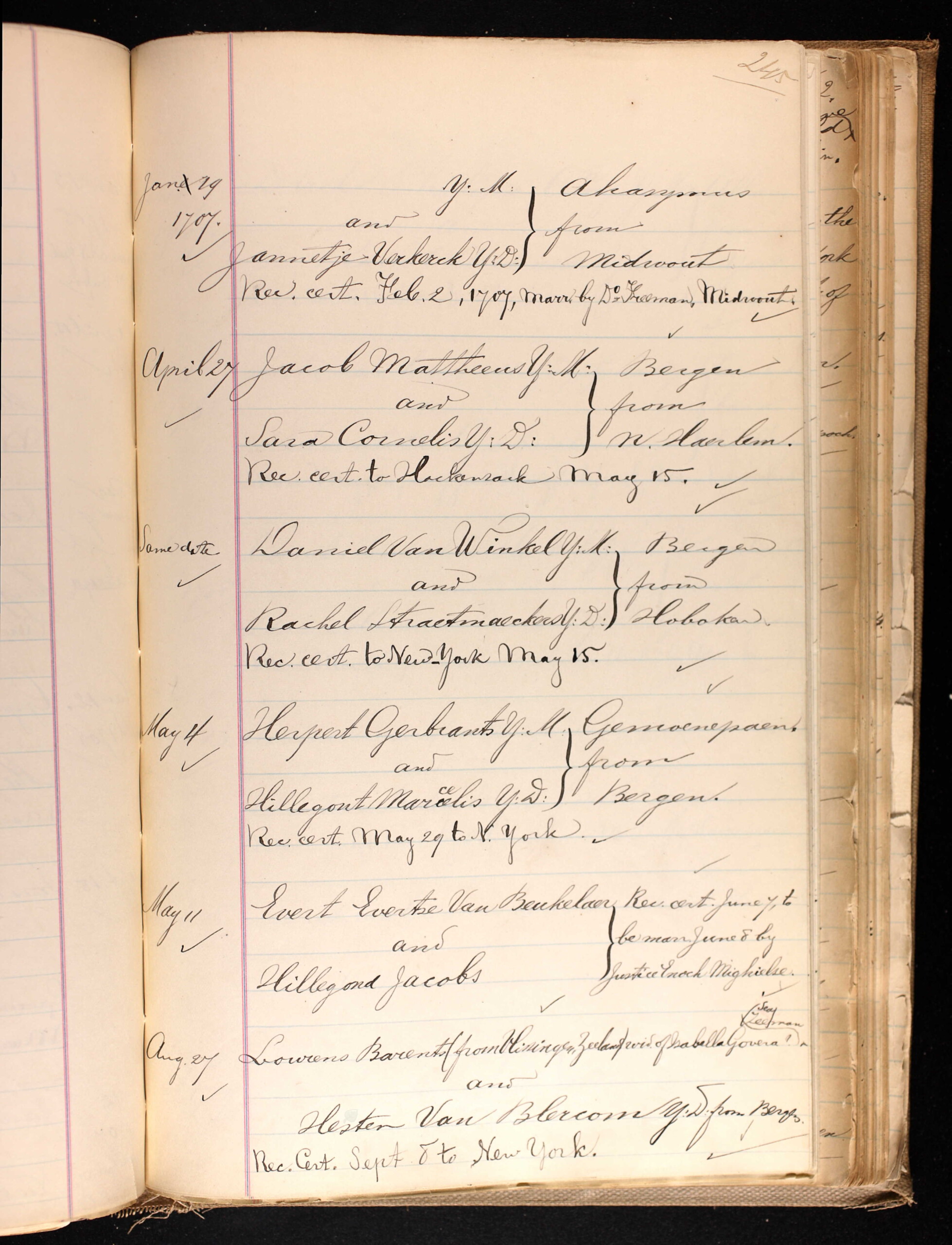 On September 9, 1707, Hester married Laurens Barents in New York. They had two children; Barent Laurens (1709) and Helena Laurens (1712). According to George Olin Zabriskie, Hester was probably the Hester Van Blarcom who married Martin Salm, whose parentage has not been determined, by whom she had two daughters baptized in New York; Catherinea (1723) and Elizabeth (1725).