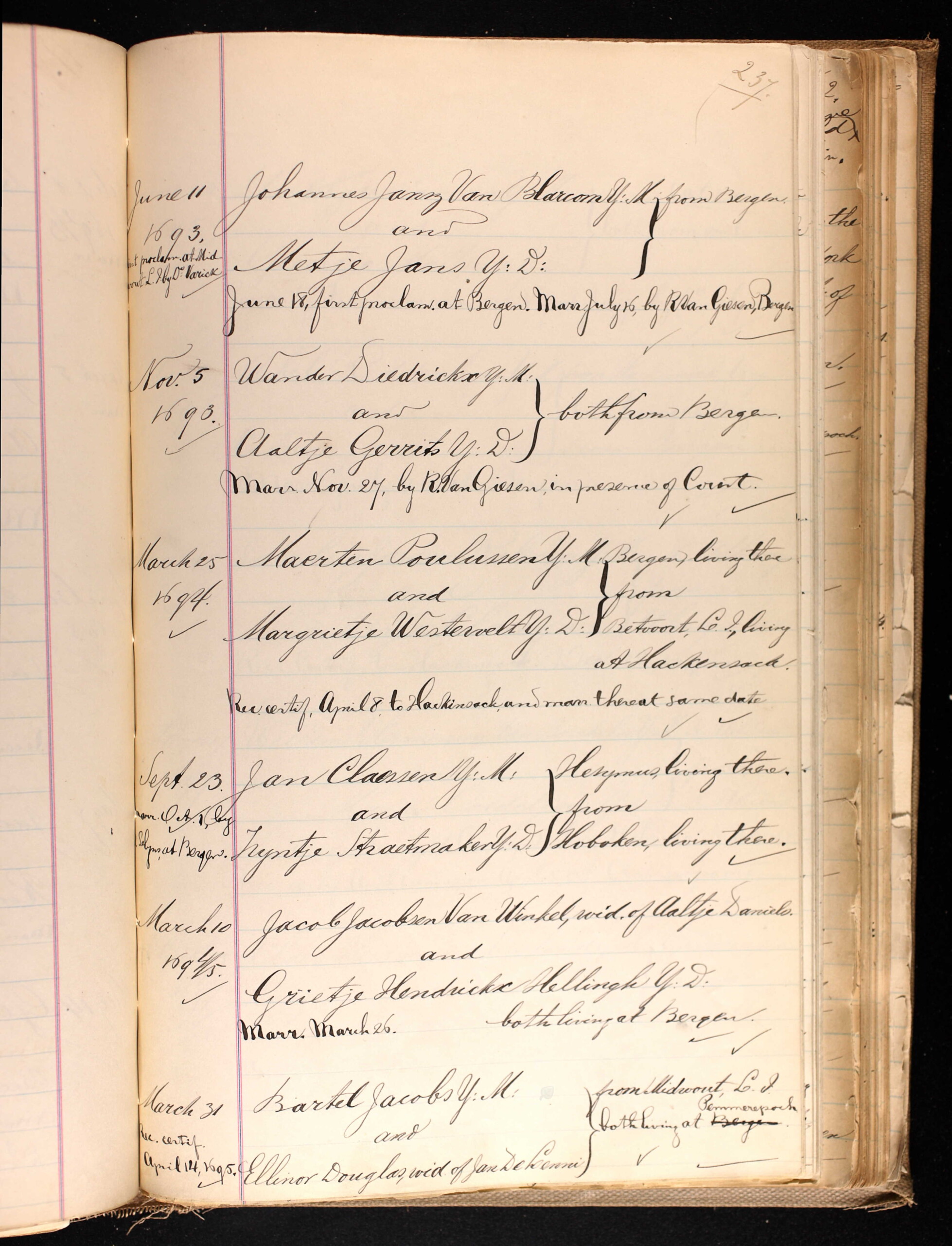 On July 16 1693, Johannes married Metje Jans Springsteen, daughter of Jan Casperse Springsteen and Maria Theunis Springsteen of Midwout (Flatbush, Brooklyn today). Johannes and Metje had seven children; Elena (m. Johannes Van Seyl), Johannes (m. Jannetje Van Seyl), Marytje (1698, m. Arie Abramse Ackerman), Tryntje (m. Dirck Van Seyl), Jannetje (1702, m. Enoch Vreeland), Pieter (1705, m. Rachel Van Seyl), and Lea (m. Hendricus Bosch).