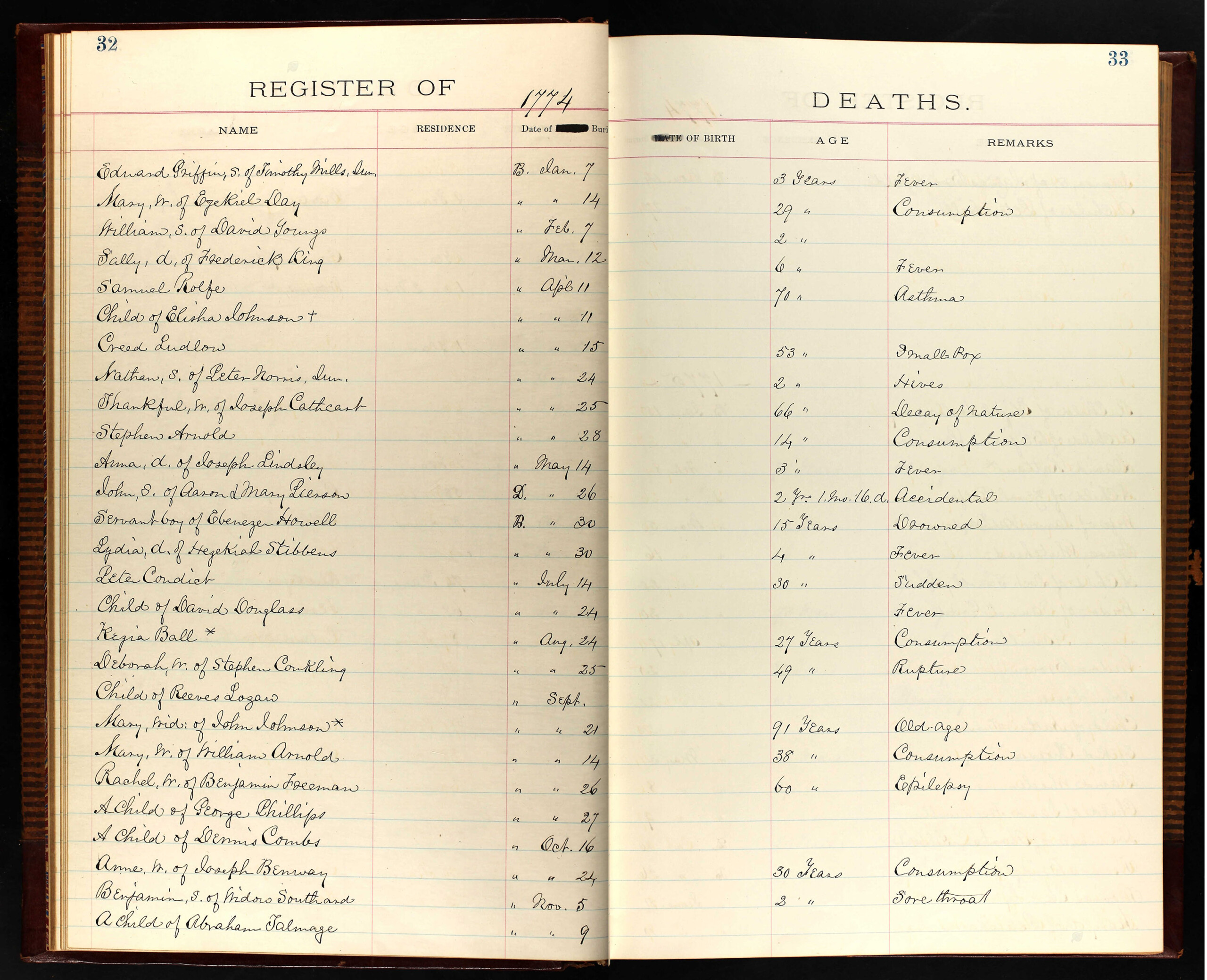 Kezia Ball died of consumption on August 24, 1774 at the age of 27. Consumption is what is now known as tuberculosis and was one of the most common killers of young adults in 19th century America. Consumption was characterized by fever, chills, flushing of the cheeks and a veracious cough.
