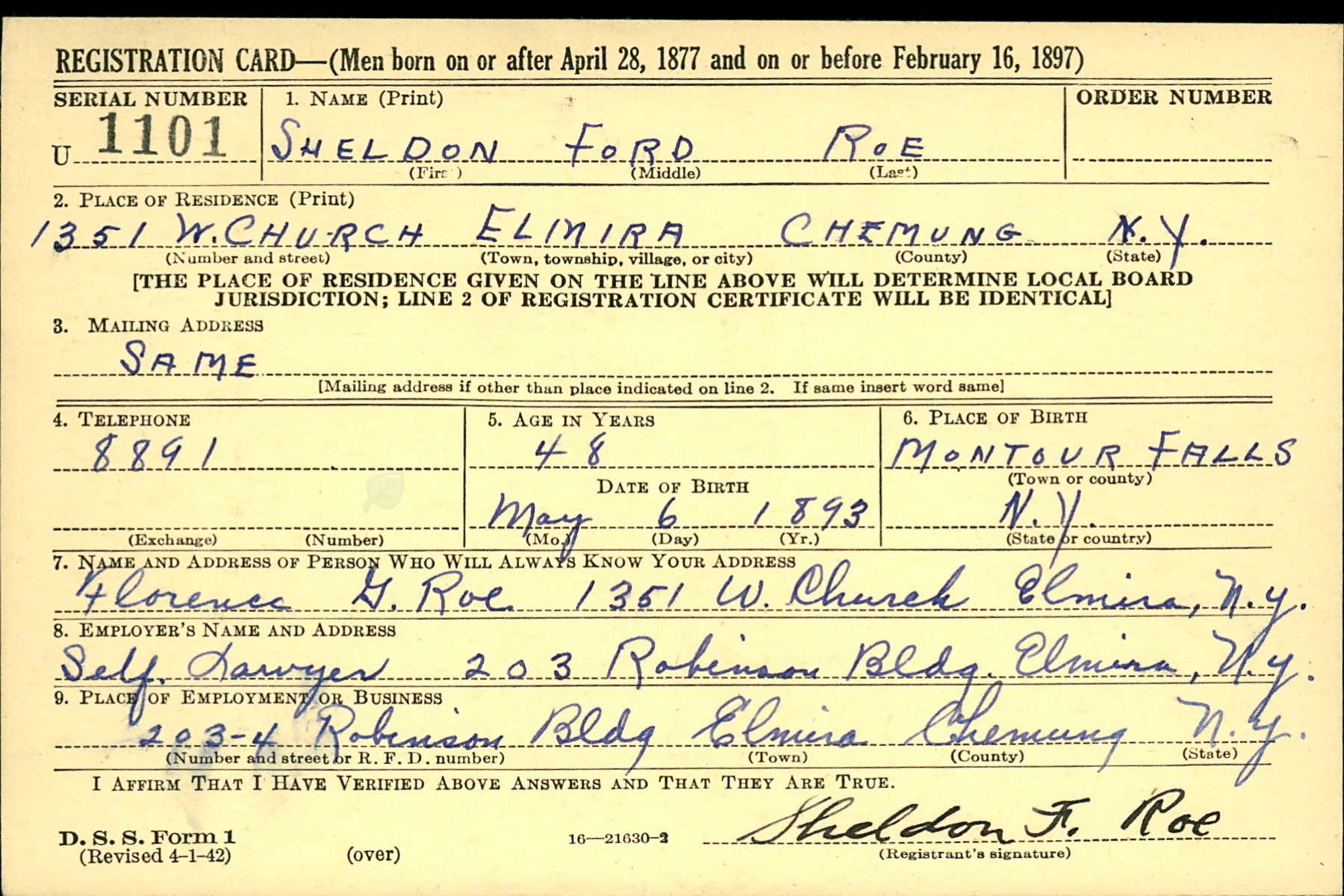 Though probably too old to serve, Sheldon registered for the World War II at the age of 49.